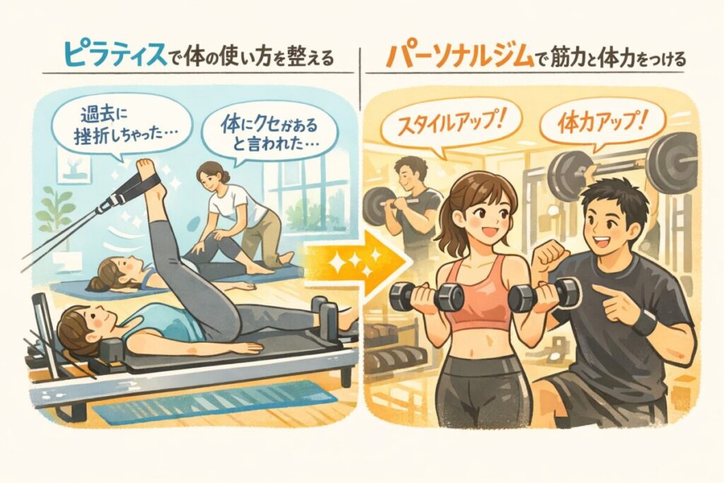 ピラティスとパーソナルジムはどっちが合うのかを分かりやすく解説し、後悔しない選び方をお伝えします。